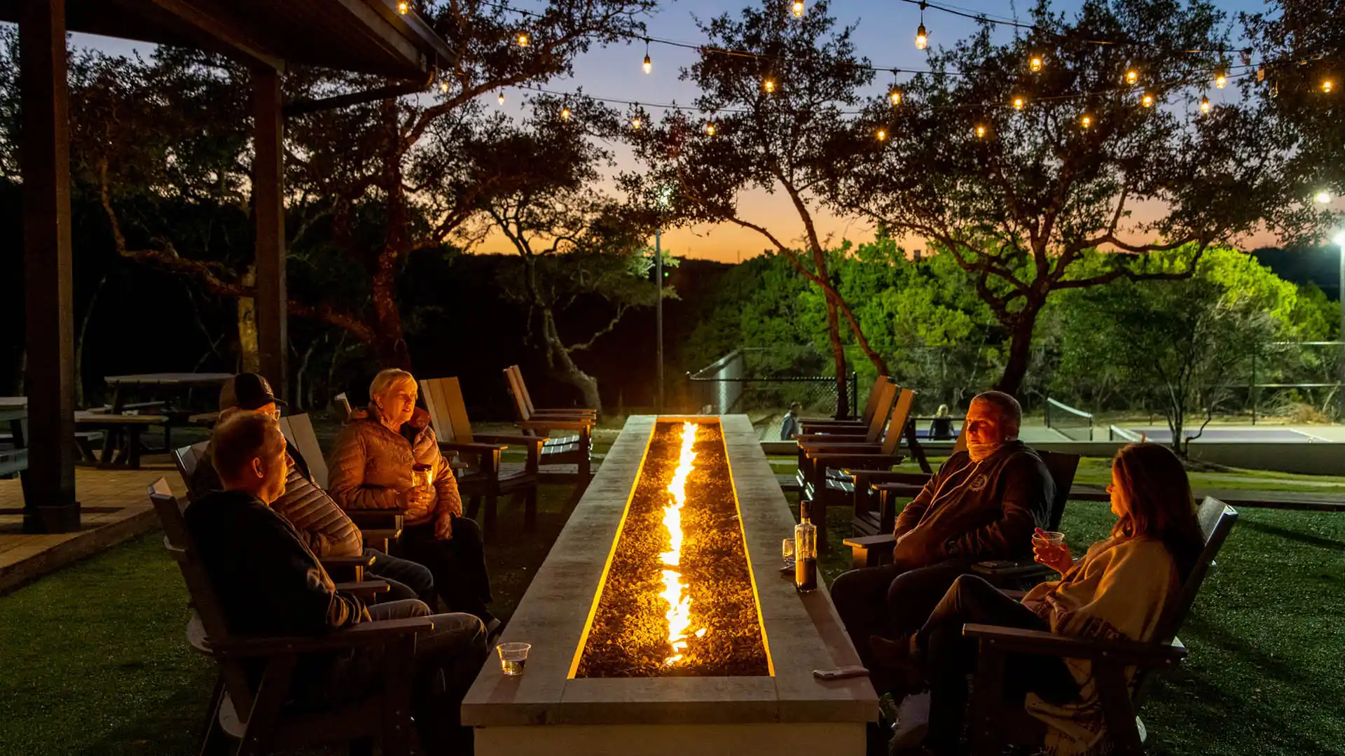 Outdoor evening view of the 5 Soul Wine Co. tasting area, featuring a large black and gold logo mounted on a white stucco wall. The warmly lit patio includes picnic tables where guests are enjoying wine under string lights, creating a cozy and inviting atmosphere surrounded by trees.